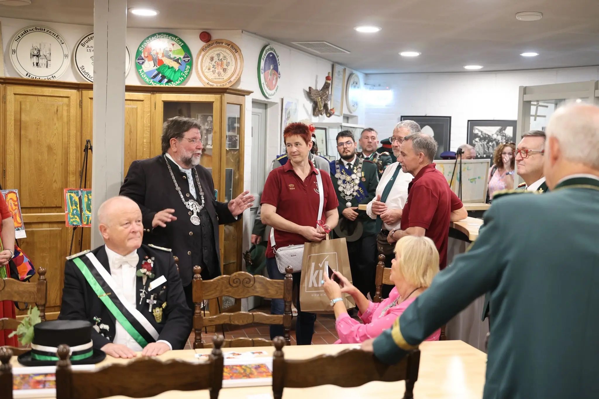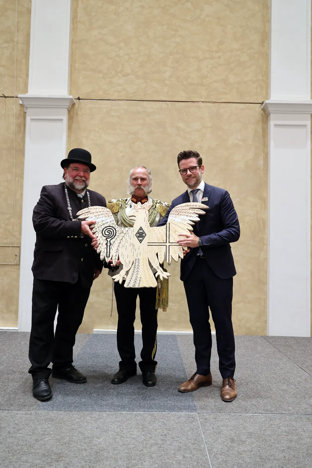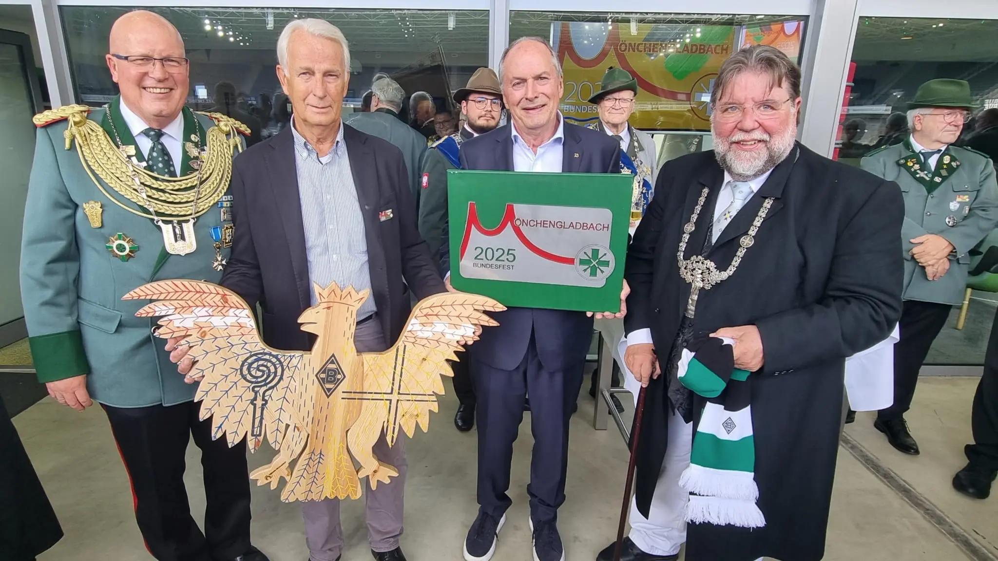 Borussia Mönchengladbach, auf dem Festabzeichen zum Bundesfest mit den Vereinsfarben vertreten, lud zur Eröffnung der Feierlichkeiten zum Empfang in den Borussia-Park. Präsident Rainer Bonhof und Michael Hollmann, Vorsitzender des Aufsichtsrates, begrüßten die gut 200 Schützengäste. Für die Bundes- und Diözesanmajestäten gab es Borussenschals. Bonhof, selbst Schützenbruder in Korschenbroich, bekam einen hölzernen Königsadler mit Borussenraute auf der Brust.