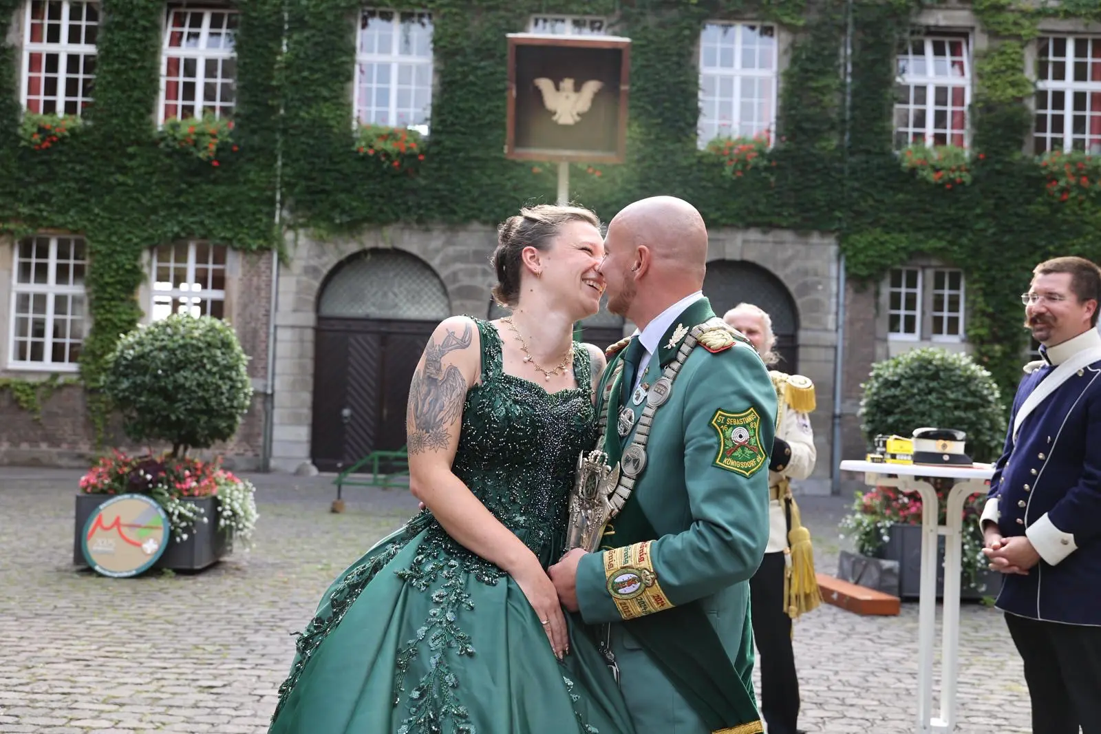 Die Liebe seines Lebens hat Bundeskönig 2024 Björn Karow beim Schützenfest gefunden. Beim Amtsantritt einem Jahr war er noch Single. Dann kamen viele Einladungen. Dabei lernte er seine Moni kennen. Die Tochter der Aachener Diözesankönigin eroberte sein Herz und war jetzt in Mönchengladbach die Frau und Königin an seiner Seite. Und ab und an gab es auch öffentliche Küsschen. Wie schön!
