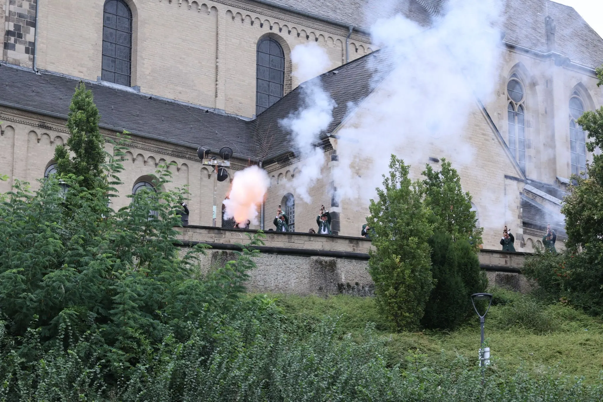 Rechtzeitig zur Krönung war die Majestät zur Stelle. Die Zeremonie am Fuß des Gladbacher Abteibergs (mit der Münsterbasilika als wunderbare Kulisse) schien von Regen bedroht, doch das Unwetter zog an Mönchengladbach vorbei. So tröpfelte nur Weihwasser zunächst auf die Königssilber, dann aus der Ferne auf die Friedenseiche zum 100jährigen Bestehen des gastgebenden Bezirksverbandes. Weil der Baum aber 100 Meter entfernt stand, entschied sich Monsignore Kleine stellvertretend den örtlichen (recht stämmigen) Bezirksbundesmeister zu segnen.