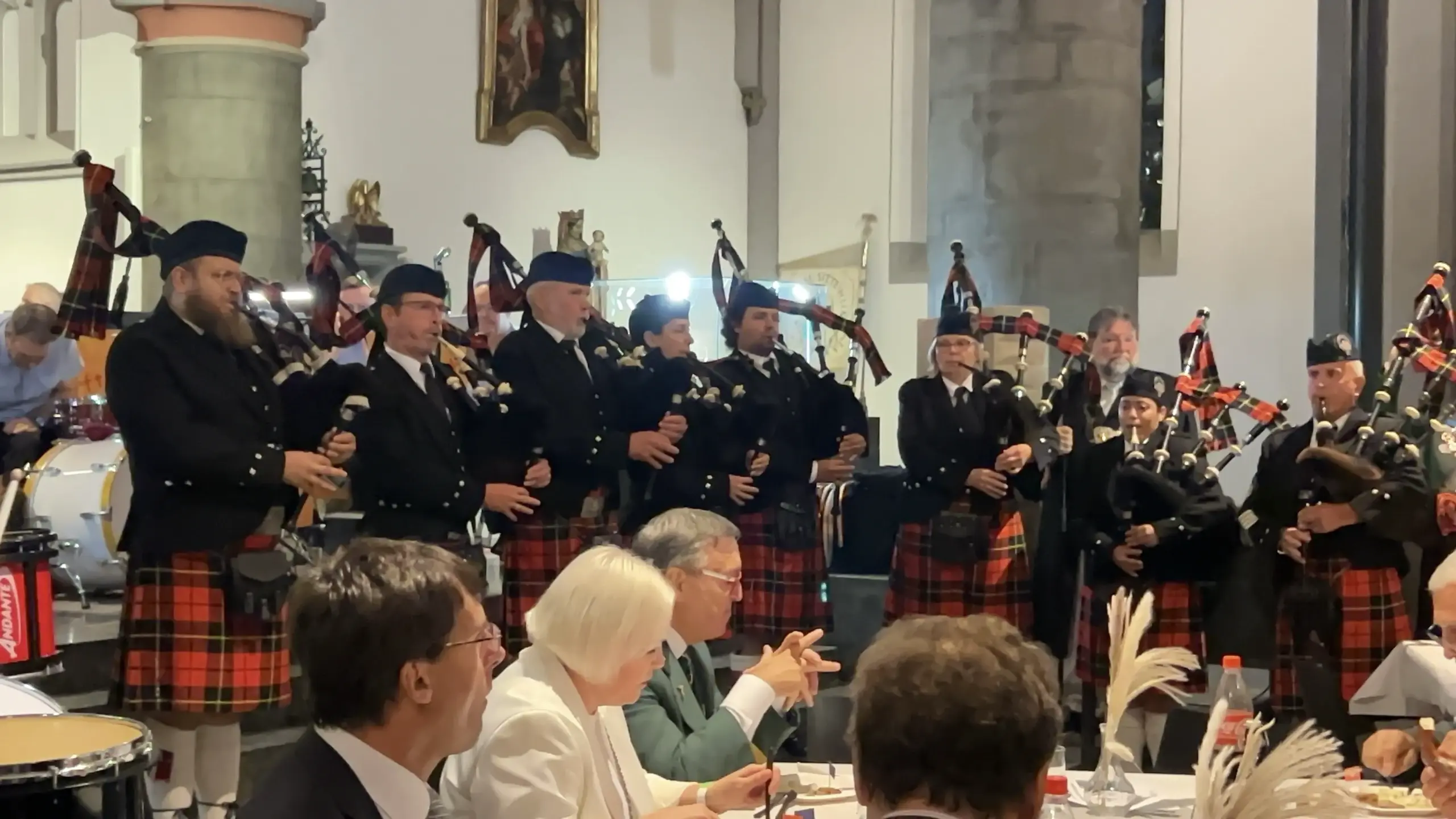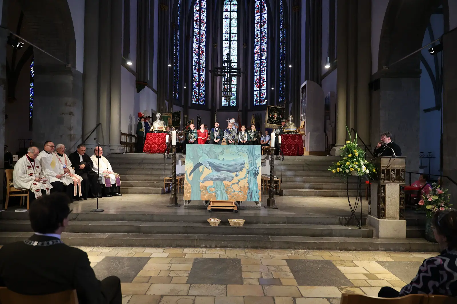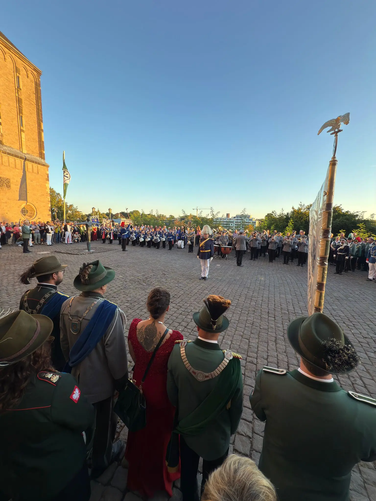 Der fröhliche Ausklang auf dem Alten Markt knüpfte an den Auftakt mit ökumenischen Gottesdienst, Zapfenstreich und Brudermahl an. Thema: Wir geben Heimat. Der NRW-Finanzminister Marcus Optendrenk hatte in seiner Ansprache die stärkende soziale Kraft bruderschaftlichen Wirkens betont. Der evangelische Pfarrer Till Hüttenberger hatte zu einem Bild der ukrainischen Künstlerin Marina Yakovenko Svida gepredigt. Die junge Frau, mit ihren drei Kindern vor dem Krieg geflohen und in Mönchengladbach aufgenommen worden, symbolisiert mit einem Wal, der mit seinem Jungtier das Wasser verlassen musste und nun durch einen Wald schwebt, die Suche nach Heimat.