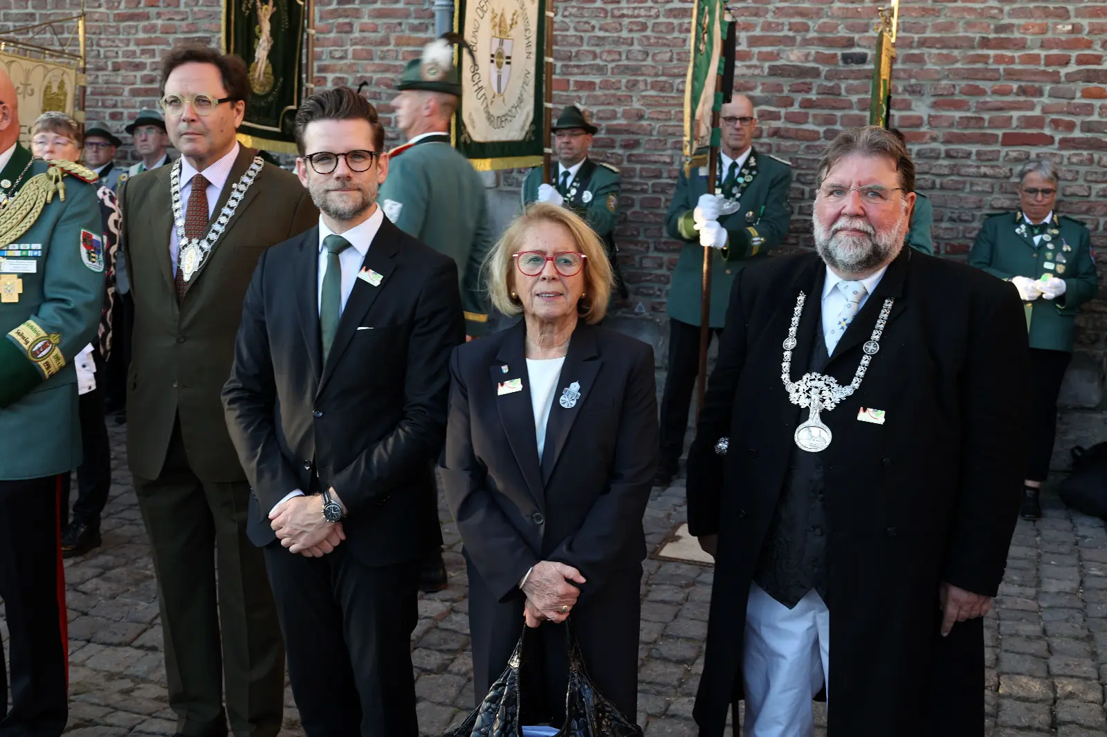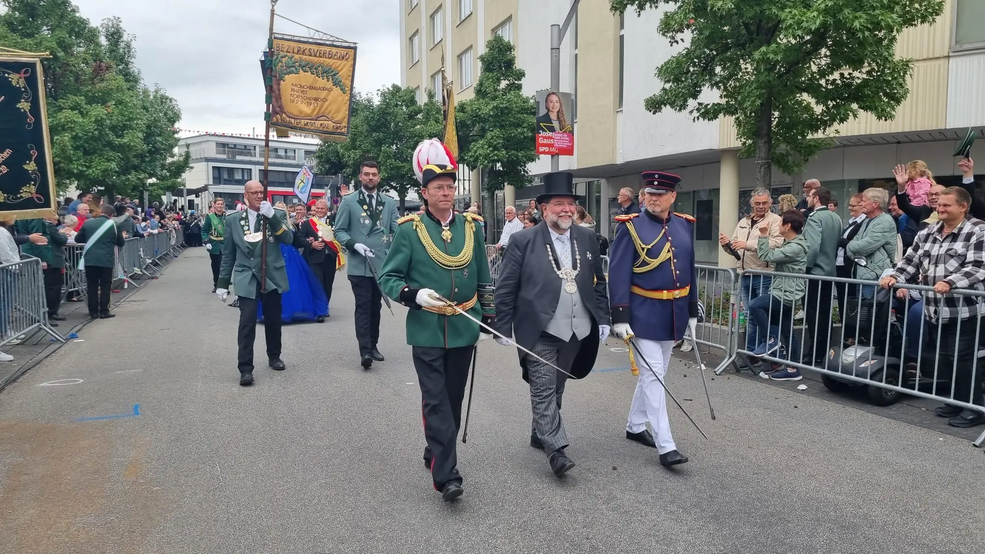 Die wohl jüngste Truppe für die Bundesstandarte schickt Mönchengladbach auf die Reise zu den Festen in Stadt und Land. Christian Reiffenrath ist der Standartenträger, Marie Sturm und Ruben Lappessen sind die Begleitoffiziere. Ein Senior marschiert vorweg: Josef Behrendt.