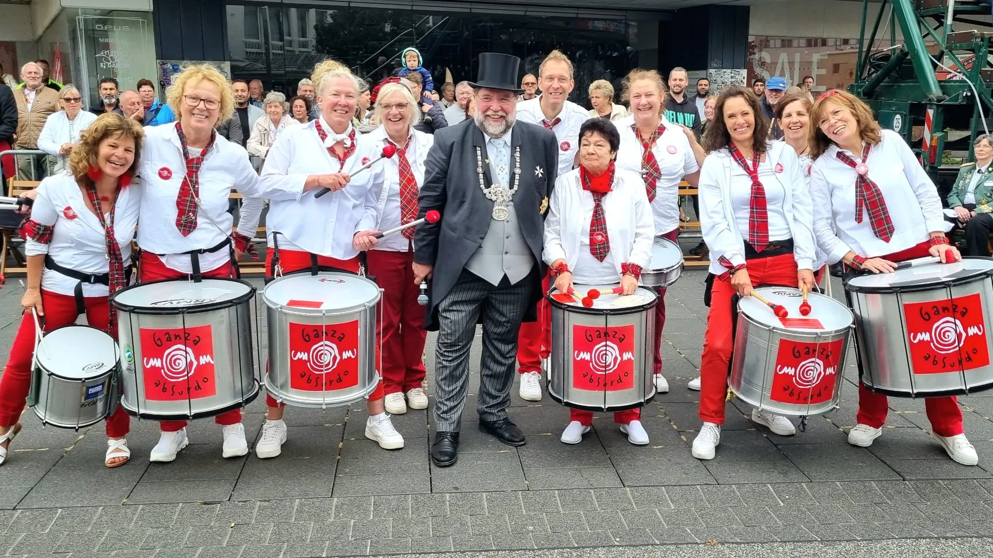 Das Fest des Miteinanders, vom Landschaftsverband Rheinland gefördert, wurde im Herzen der Altstadt gefeiert. Ein Eventhimmel, ein Großschirm wie beim ZDF Fernsehgarten, überspannte den Alten Markt, wo Party und Parade angesagt war, wo vor großem Publikum Hochmeister Emmanuel Fürst zu Salm Salm und Bundesschützenmeister Robert Hoppe die neuen Bundes- und Diözesanmajestäten vorstellten.