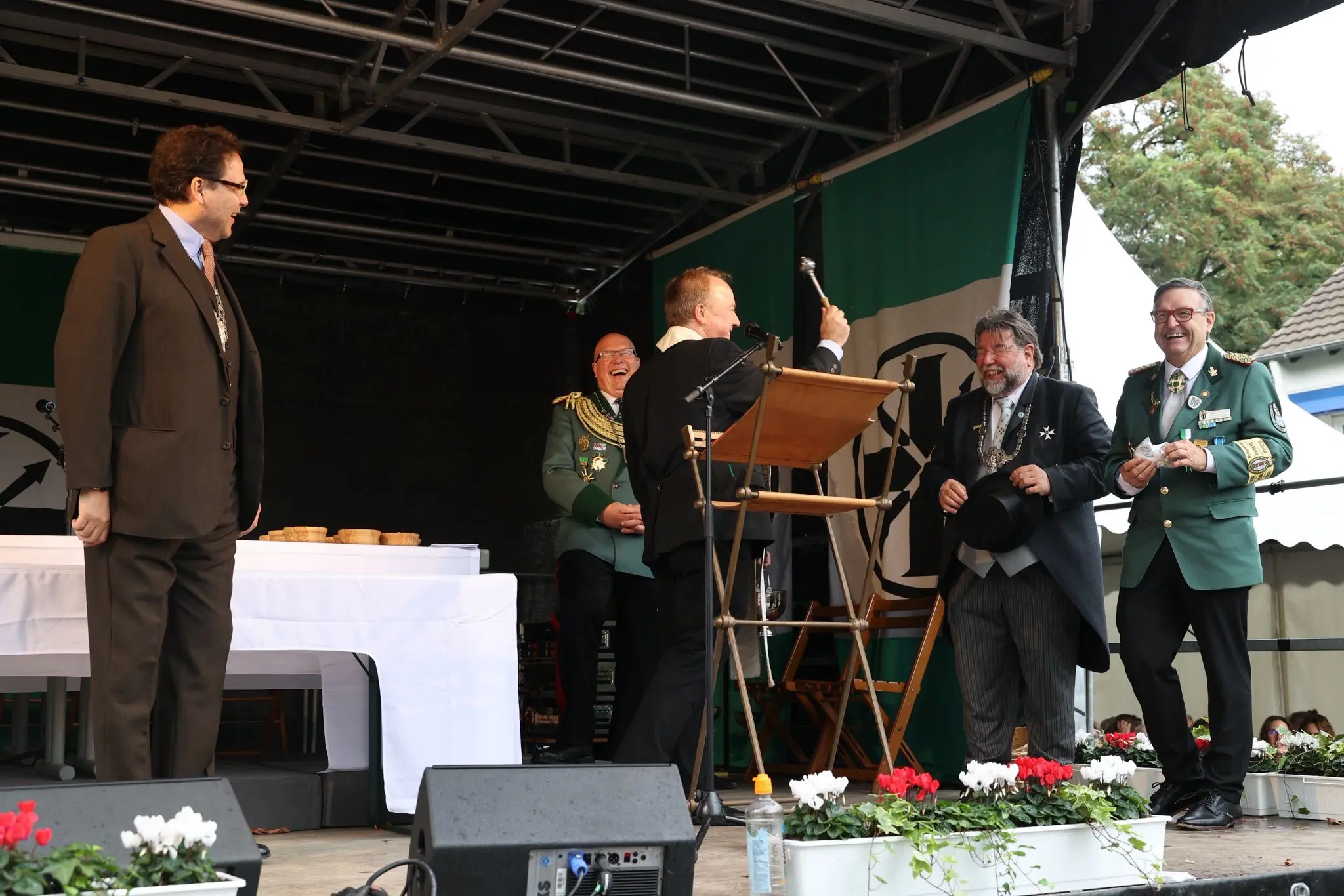 Christian Engel, Tambourmajor des Bundesschützentambourkorps “Mit vereinten Kräften” Wickrath, ist ein musikalischer Tausendsassa. Als bei der Proklamation eine Wartepause überbrückt werden musste, stellte sich kurzerhand auf die Bühne und spielte mit Flöte und Trommelbegleitung “Amsterdam”. Die Menge jubelte.